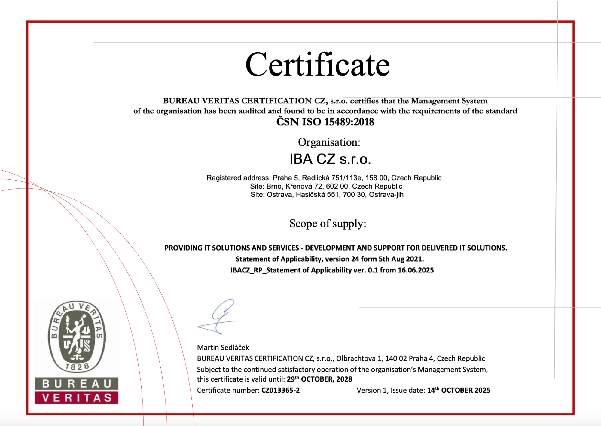 On October 14, 2025, IBA CZ, a member of IBA Group, achieved certification that confirms compliance with ISO 15489-1:2016 Information and Documentation – Records Management. Part 1: Concepts and Principles.